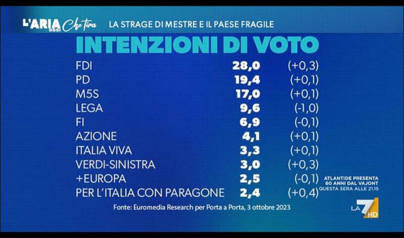 di PIERANTONIO LUTRELLI - Un recente sondaggio condotto da Euromedia Research per Porta a Porta del 3 ottobre scorso, rilanciato da La7, ha rivelato i dati sulle intenzioni di voto in Italia. Vediamo nel dettaglio cosa – a parer mio - indica il grafico con i risultati delle intenzioni di voto che sono i seguenti: